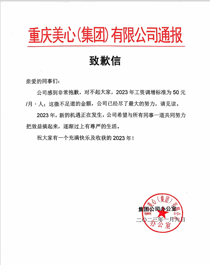 近日,重庆美心集团一份关于2026年度调薪的致歉信受到关注。信中称,今年公司决定为基层员工涨20元月薪,并对涨幅较低表达歉意,“非常抱歉,对不起大家”。