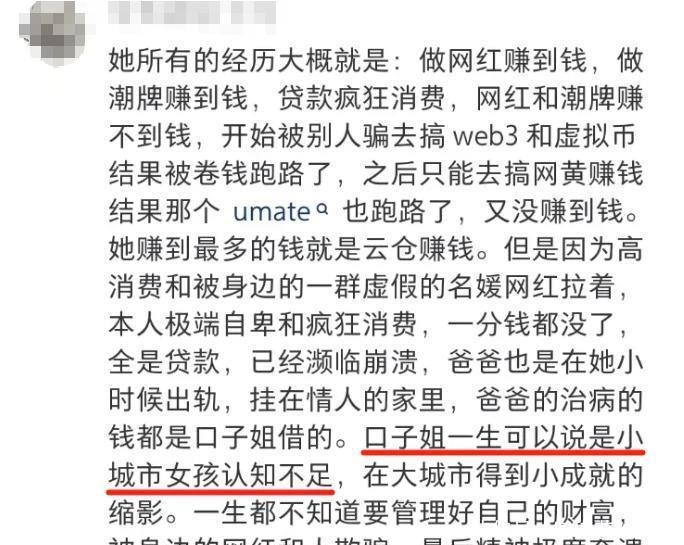 比如,投资各种虚拟币和数字藏品,把毫无用处的这些东西高价卖给自己的粉丝,可惜最终被人摆了一道,让债务问题雪上加霜。在把所有钱都亏完以后,口子姐想到自己还是有点颜值的,即便是已经发胖的情况下,她也依旧在“擦”的路一往无前开始赚快钱。
